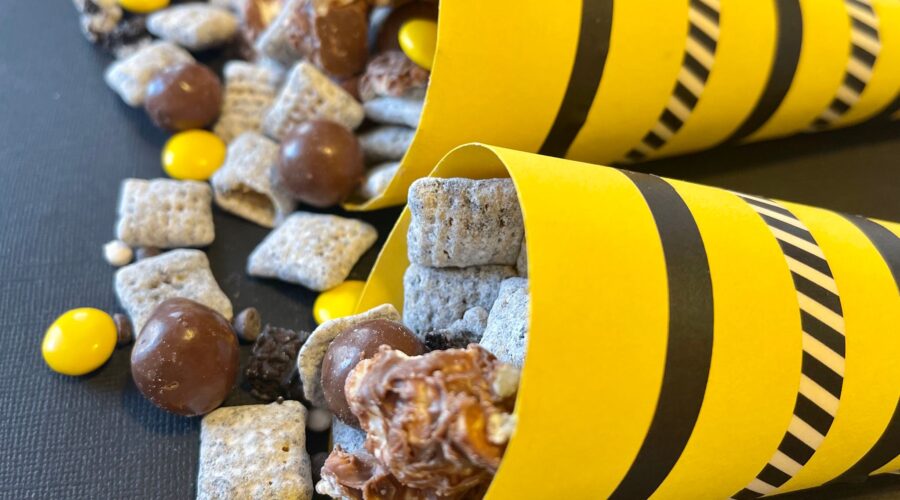 My kids and I adore the loveable Rubble from Paw Patrol! To celebrate the new release of Rubble on the Double, we made a tasty snack mix inspired by one of our favorite pups! This snack mix includes crunchy and chocolatey construction pieces and chocolate covered boulders. The best kind of rubble there is! Plus, it comes served in a construction cone. Check it out!