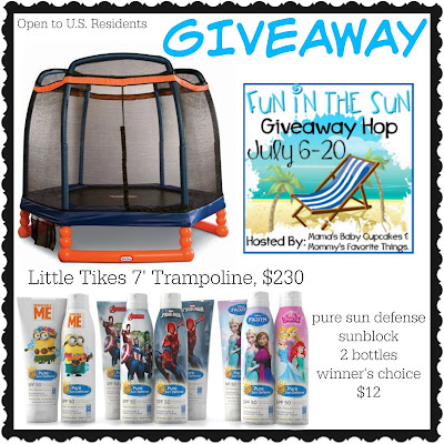 Don’t forget to enter the Grand Prize hosted by Mama’s Baby Cupcakes for your chance win a Little Tikes Trampoline and your choice of two bottles of Pure Sun Defense kids’ sunblock. Two things that are perfect for the Summer! You can read Michelle’s full Little Tikes review here, and then her Pure Sun Defense sunblock review here.