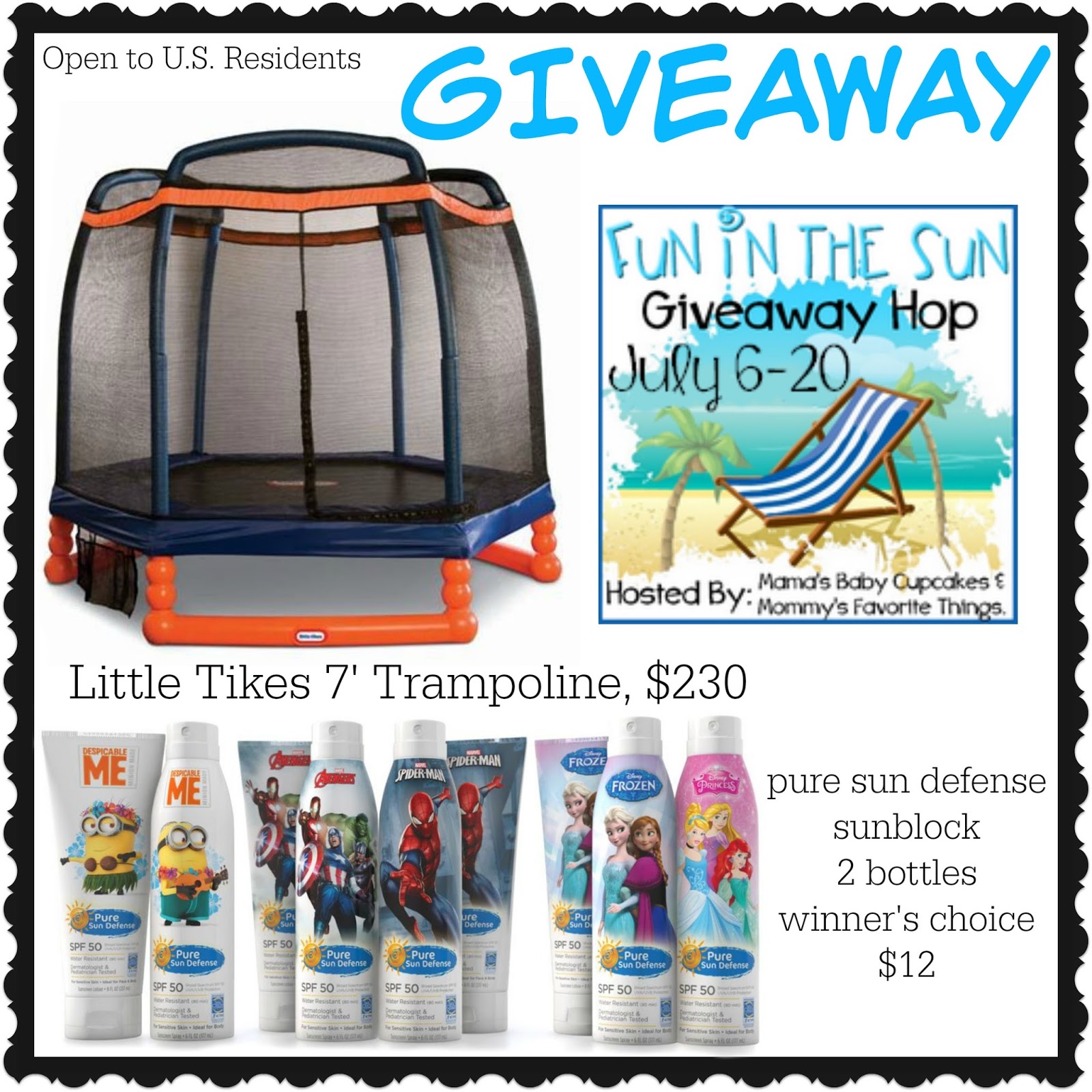 Don’t forget to enter the Grand Prize hosted by Mama’s Baby Cupcakes for your chance win a Little Tikes Trampoline and your choice of two bottles of Pure Sun Defense kids’ sunblock. Two things that are perfect for the Summer! You can read Michelle’s full Little Tikes review here, and then her Pure Sun Defense sunblock review here.